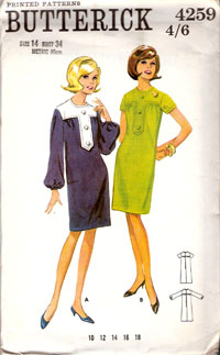 1960s Shift - 1920s style dropped waist. Although this particular pattern borders on the Am Dram, the shape is nice and would work well without the under skirt. Cap sleeves and lots of strong emphasis at thehemline adds interest